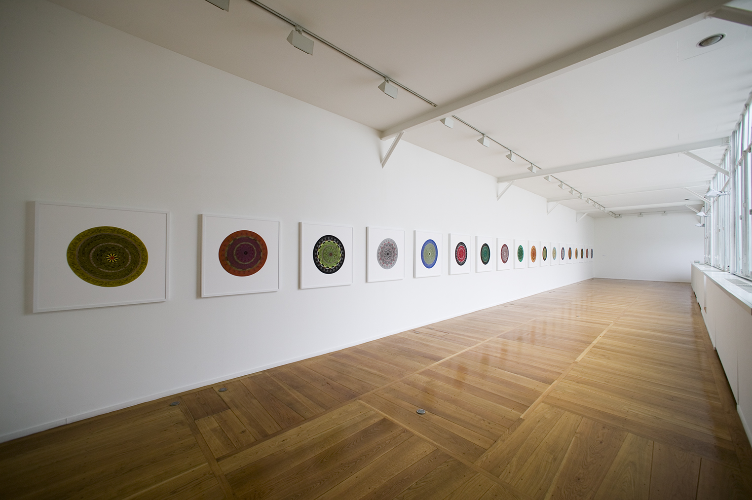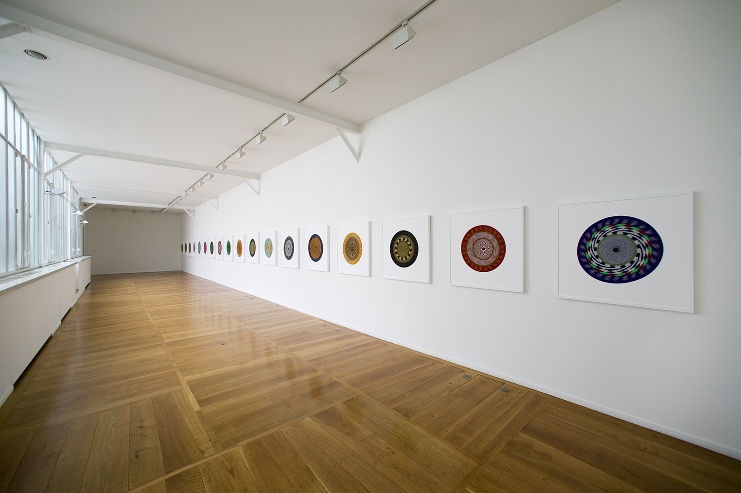 Works on paper, works in paper, Target is a series of « paintings » that begun simultaneously with the filming of Grand Prix. Fascinated by the geometry of the dart boards, the same way he has been by the abacuses or the crosswords, Stephen Dean understood that their structure is modifiable: a roll of paper so tightly rolled that it is possible to apply colors on it. By unraveling the roll of paper, sometimes up to 80 meters long, Dean dislocates the order of colors and animates the motifs all the way to disturbing the eye of the spectator. Target summons souvenirs and references such as Picabia, Johns, Vasarely or Riley, as well as Tex Avery cartoons.