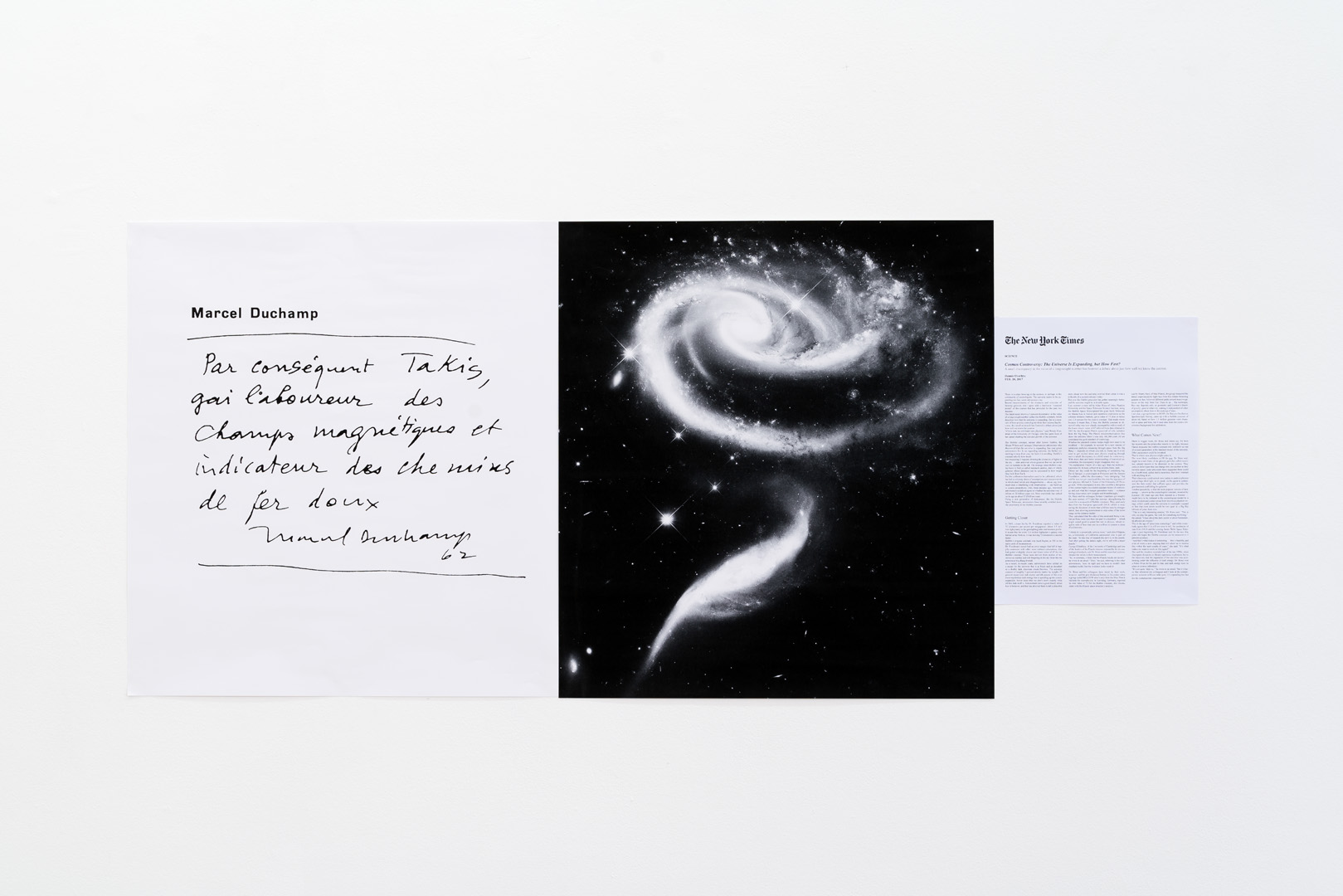 In November 1960, a few months before Yuri Gararin’s first space flight, during a performance entitled “Impossible, a man in space” at the Iris Clert Gallery in Paris, Takis launched his friend, the poet Sinclair Beiles, into space with the use of magnetic fields. The latter, suspended in space by a magnet attached to his belt, defied gravity and proclaimed, “I am a sculpture”.