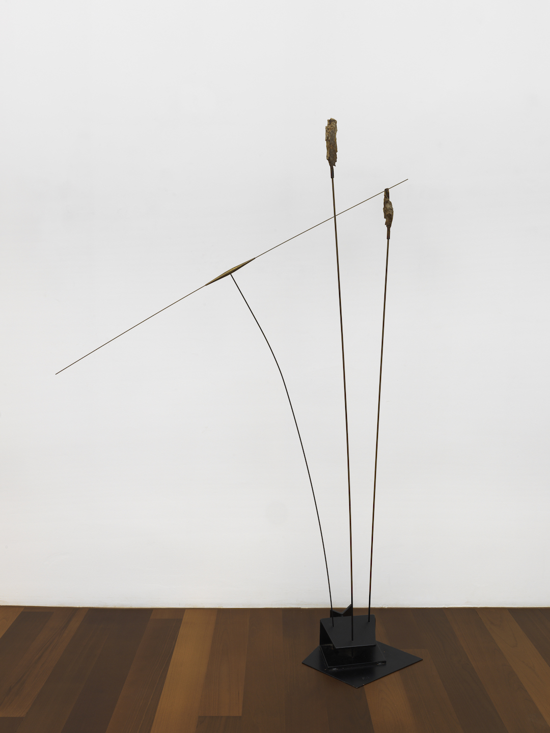 Panagiotti Vassilakis Takis was born in Athens in 1925. He was taught by a Greek craftsmen working on stone. In 1946 he began his sculptural research with works that recall ancient art and Giacometti’s spindly characters, and then evolved towards more refined forms. In 1954, he moved definitively to Paris where he joined the studio of Brancusi for a few months. Then, he created Signals and started to exhibit his work in Paris. He is one of the few reformers of sculpture after Giacometti and Brancusi. However, his work is unclassifiable, it is never assimilated to a school, it is based on the exploration of energy and the representation of invisible forces.