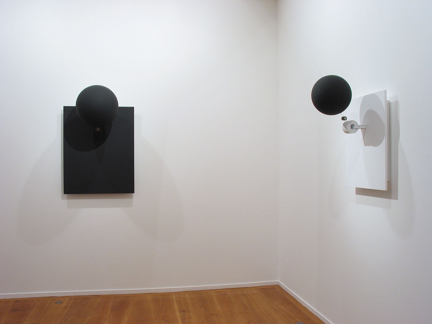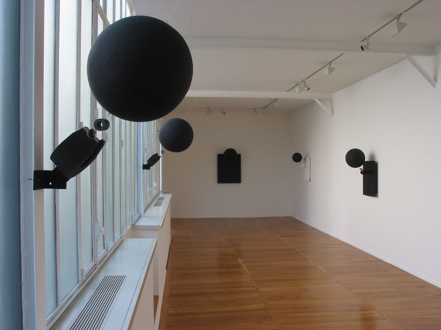L’exposition à la galerie Xippas est constituée de 9 Sculptures magnétiques composées de tableaux et d’aimants et de 9 boules métalliques, l’ensemble figurant les 9 planètes du système solaire. Chaque boule, de couleur noire, maintenue en suspens dans le vide par l’attraction magnétique, flotte à quelques centimètres de la surface de toiles, elles-mêmes noires. La force magnétique agit contre la force de gravité. La sculpture agit comme révélateur de l’invisible et plus particulièrement ici de l’énergie accumulée par les trous noirs. Selon des observations récentes, l’univers serait dominé par ce phénomène aux propriétés antigravitationnelles peu communes, mais toujours incompris par les scientifiques eux-mêmes.