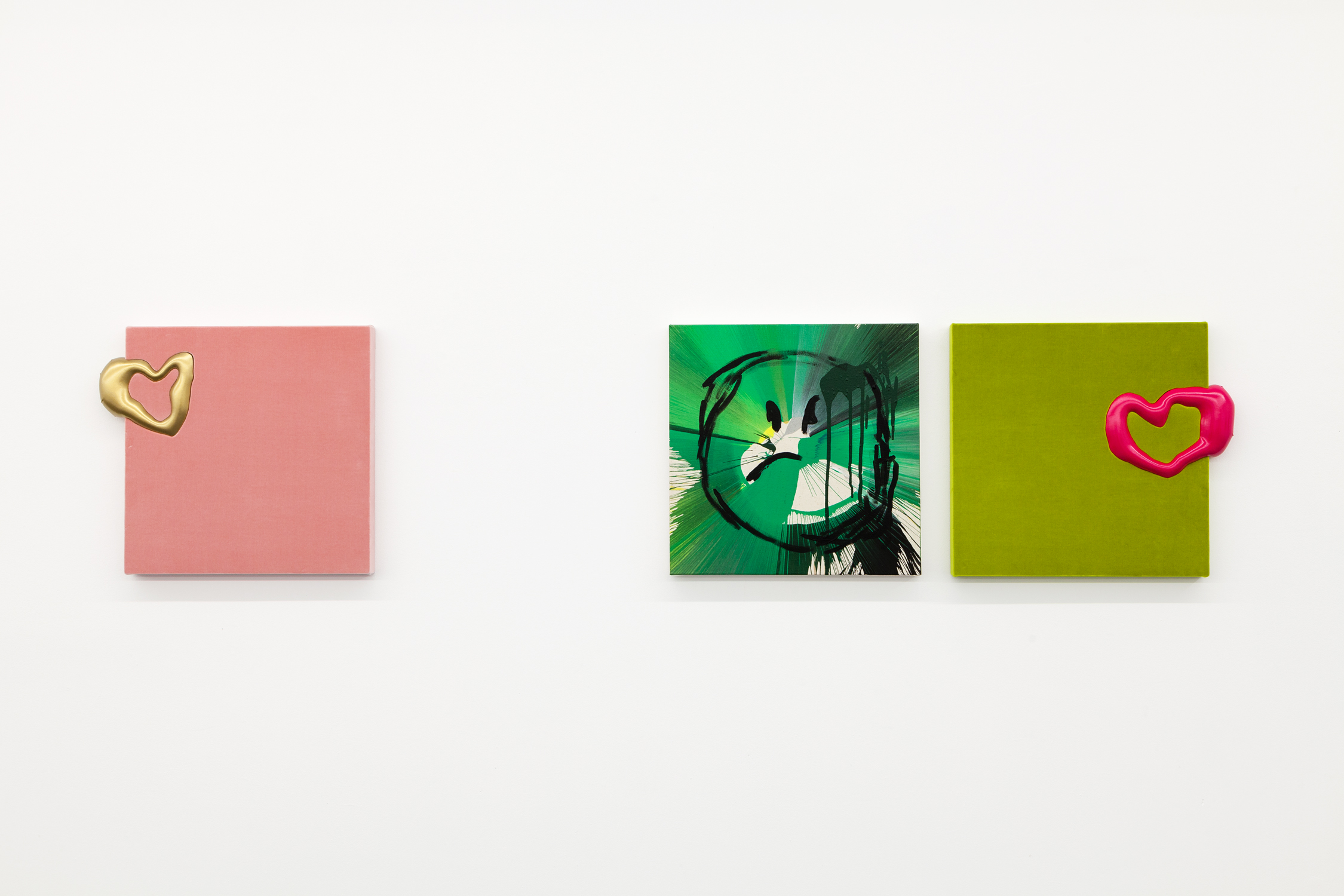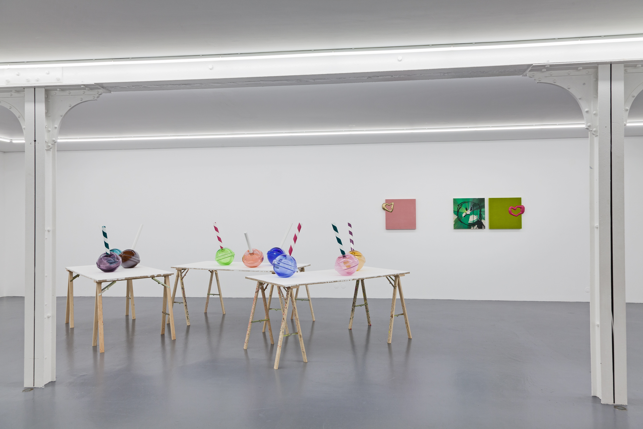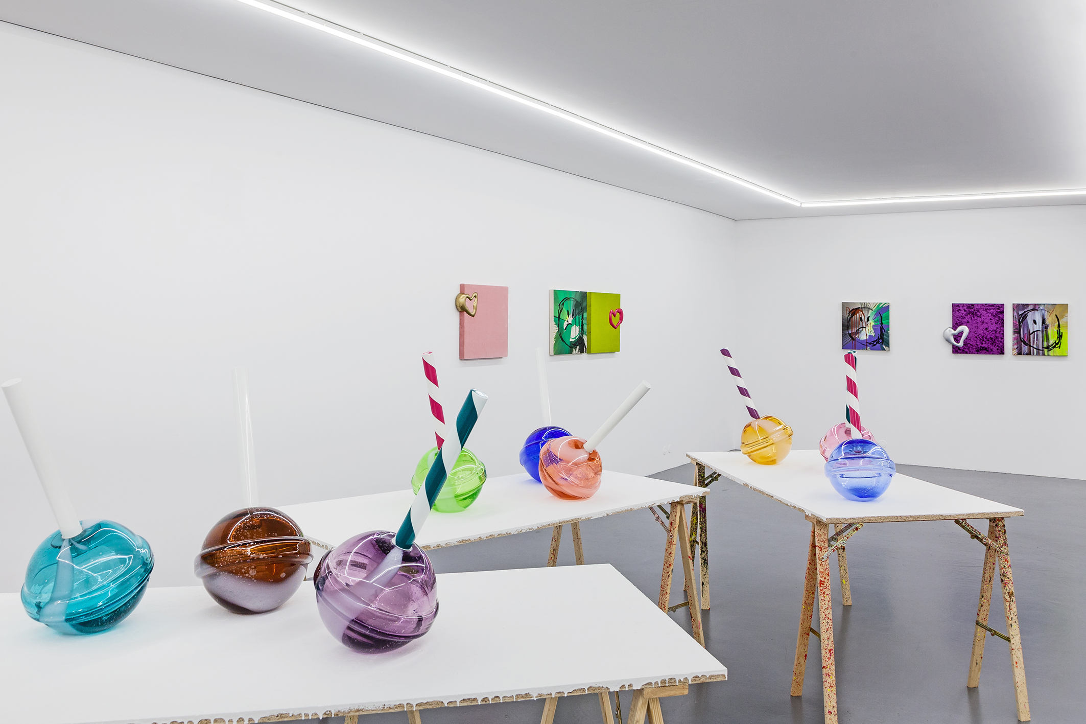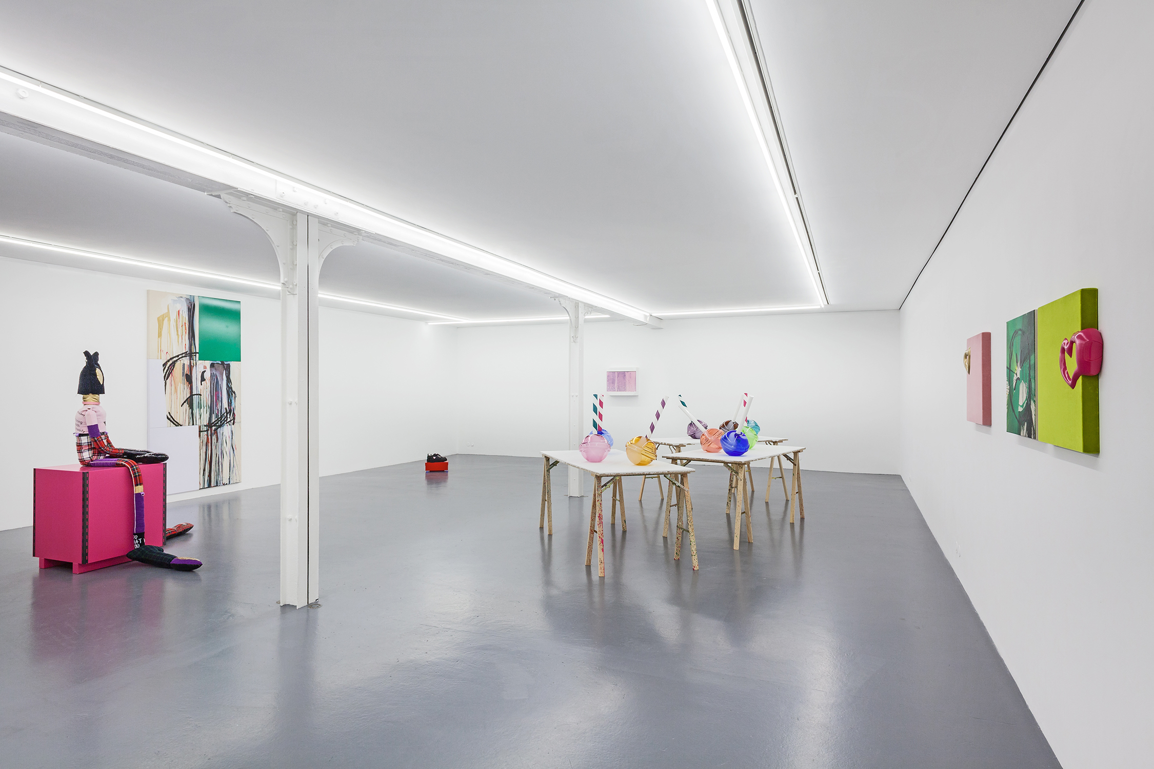 For his first exhibition at Xippas Paris, Thomas Liu Le Lann presents a new set of sculptures and paintings that cover a wide spectrum of techniques. Entitled 17, the exhibition features velvet paintings adorned with sick vinyl hearts, oversized glass lollipops, a pair of shoes, a replica of the pharmacy cabinet in his apartment, a poem intended for a lover, and a soft hero sculpture, both guardian and actor of this installation. The exhibition is accompanied by an essay by Olga Rozenblum.