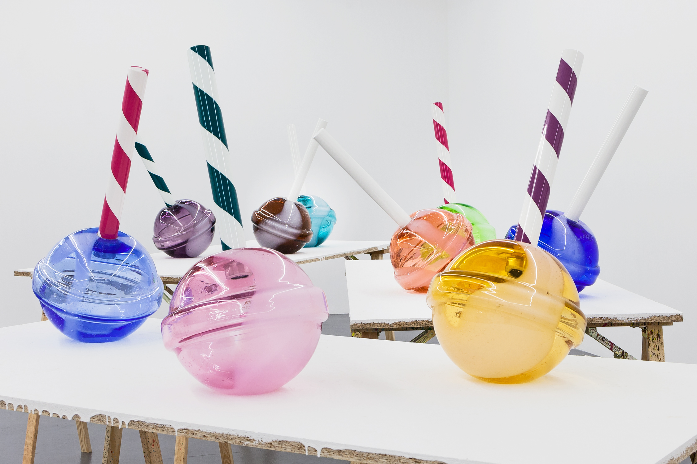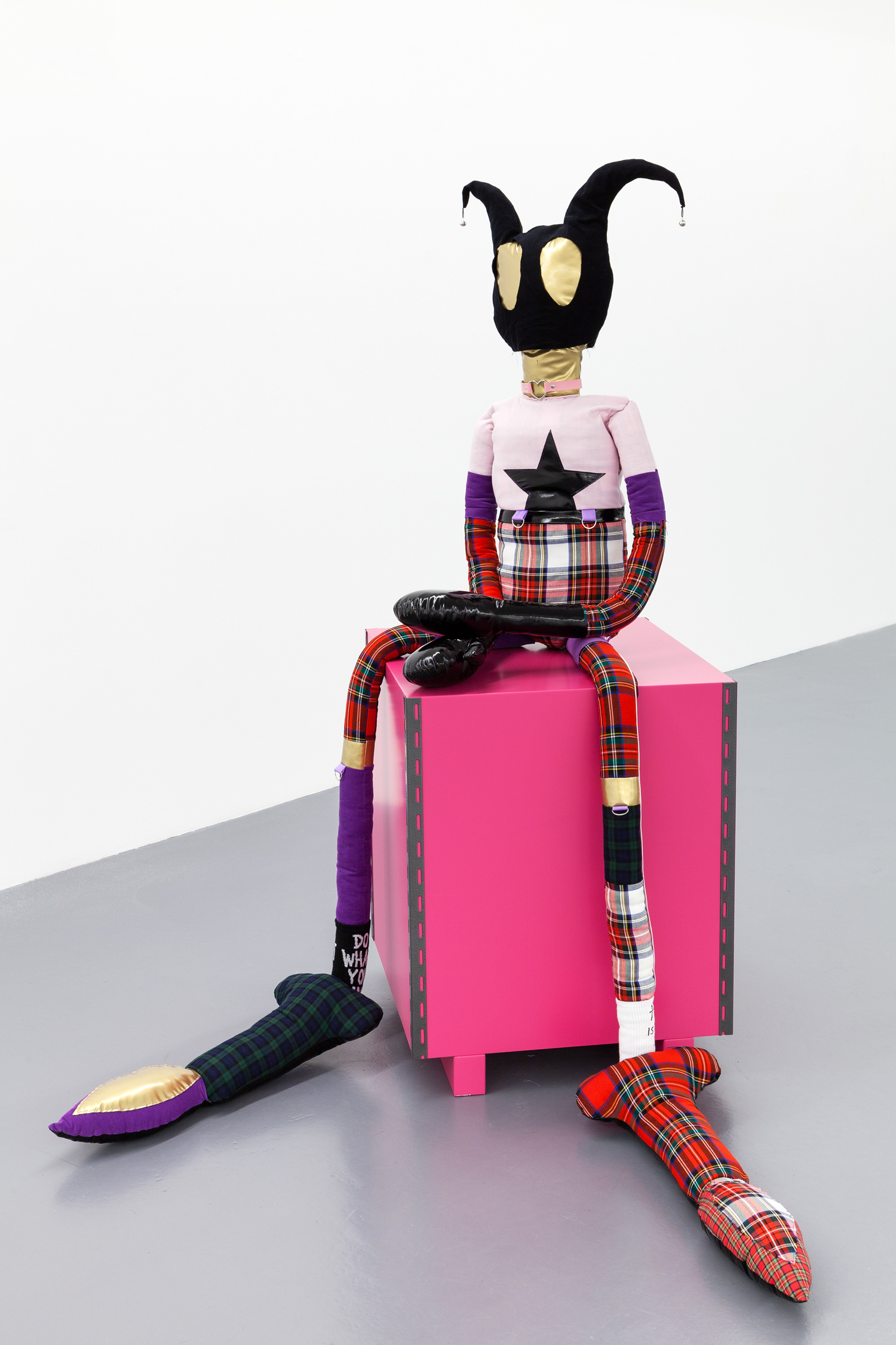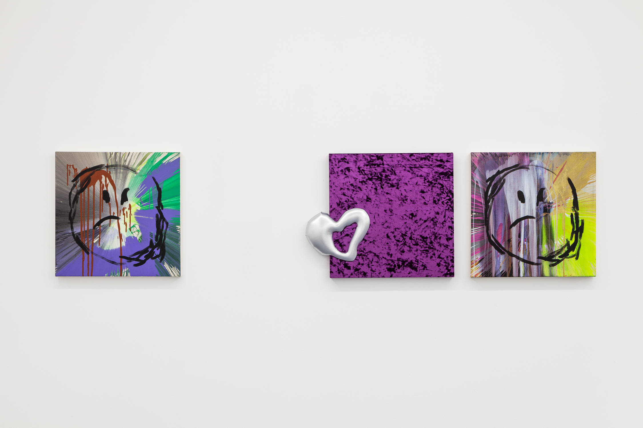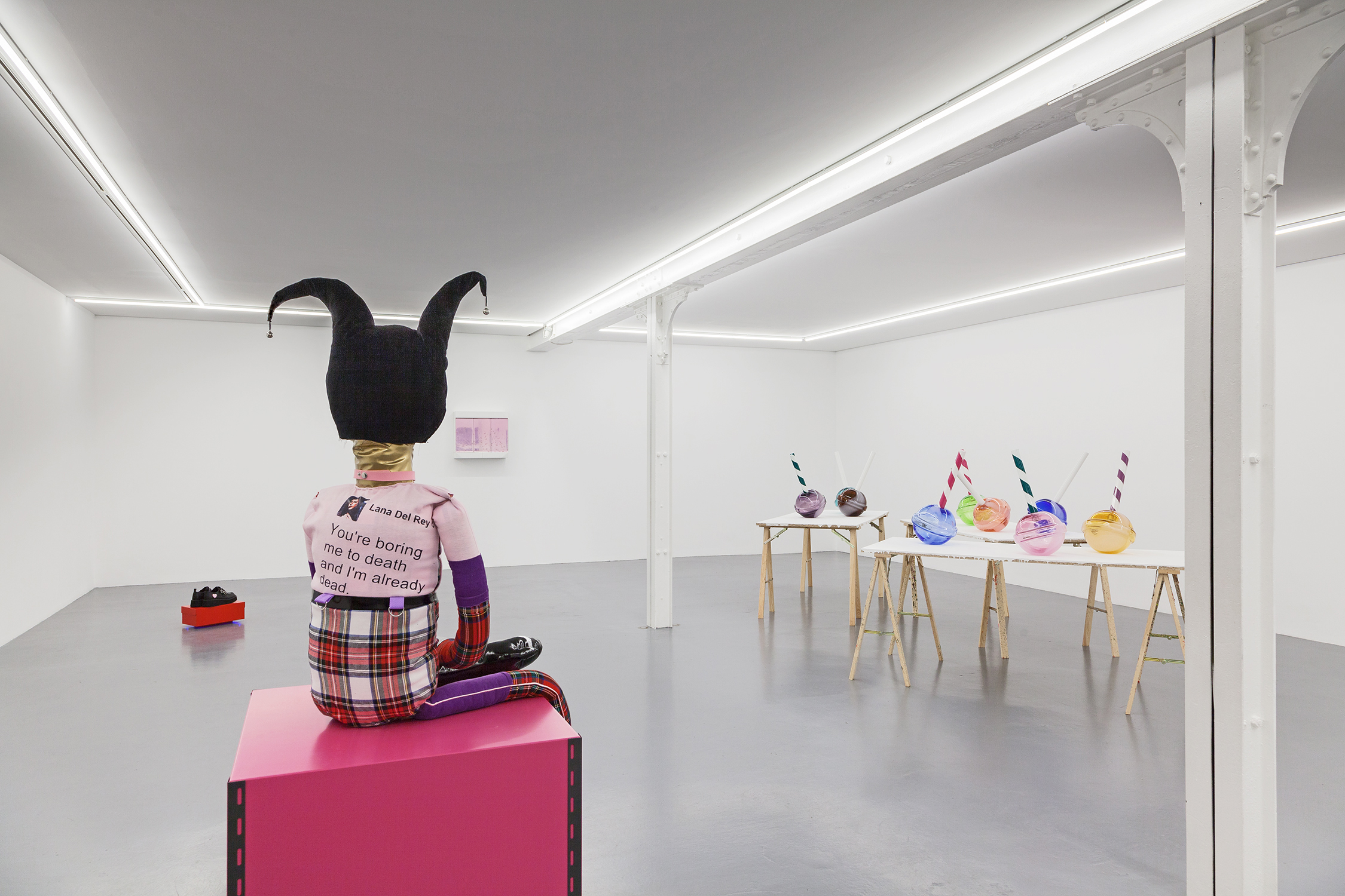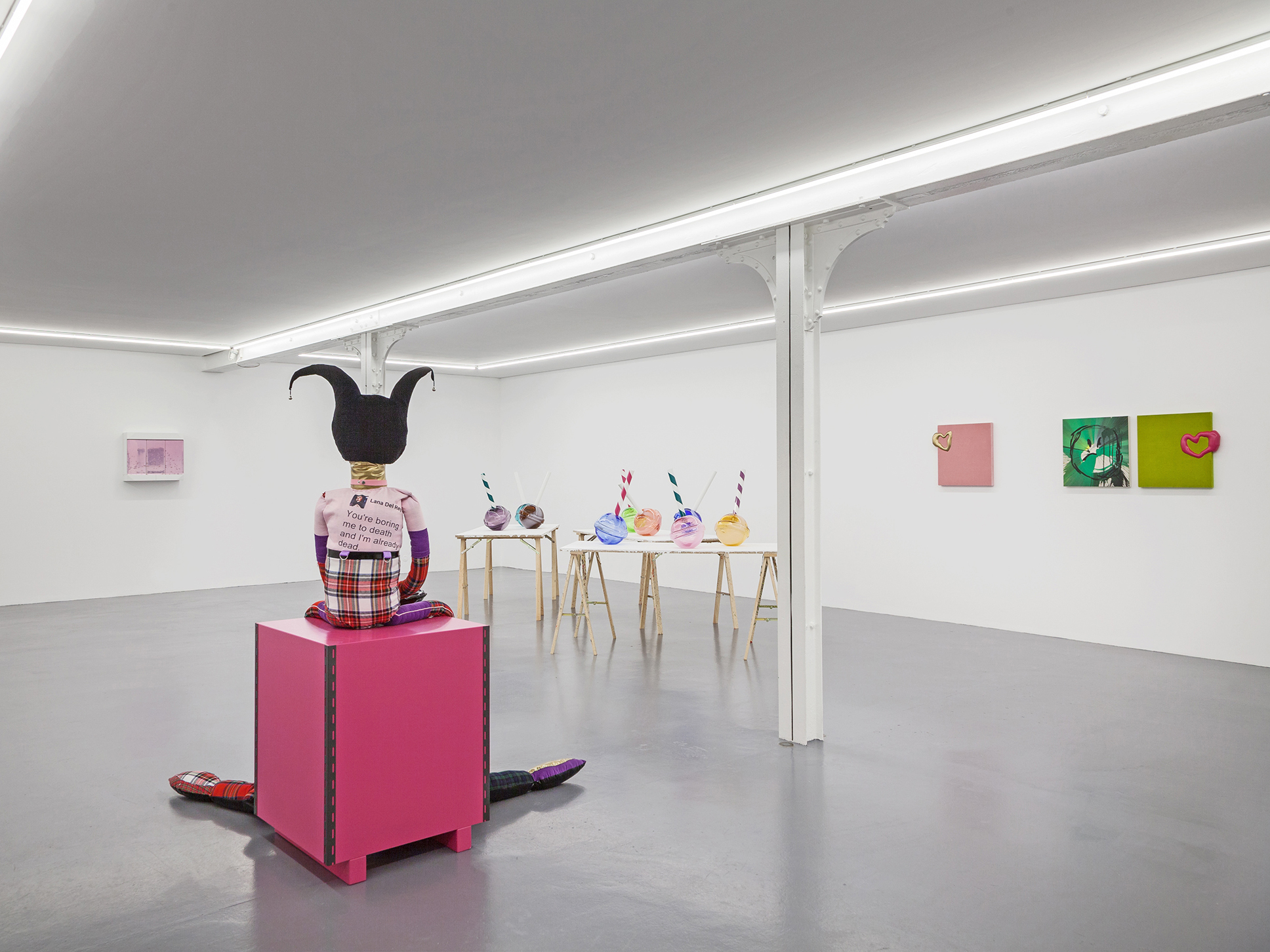 For his first exhibition at Xippas Paris, Thomas Liu Le Lann presents a new set of sculptures and paintings that cover a wide spectrum of techniques. Entitled 17, the exhibition features velvet paintings adorned with sick vinyl hearts, oversized glass lollipops, a pair of shoes, a replica of the pharmacy cabinet in his apartment, a poem intended for a lover, and a soft hero sculpture, both guardian and actor of this installation. The exhibition is accompanied by an essay by Olga Rozenblum.