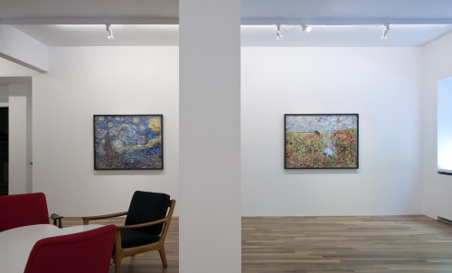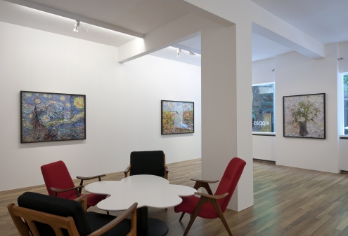 The current trend in informational overload which creates an irrevocable necessity for immediate consumption of printed material and constant news feed, leaves behind plenty of raw material for Muniz’s new works: irregular pieces and stripes from fashion, art, news magazines, with images or text, comprise the work’s structural material. Historic works of the 19th century by Manet, Cezanne, Van Gogh and others are recomposed using shreds of pictures of persons from advertising campaigns, celebrities, comic book heroes, together with parts of titles and subtitles, syllables from words and fragmented phrases. Muniz accomplishes a ‘painterly’ final result, as the interwined, irregularly torn pieces of paper give the same visual impression as the large overlapping brush strokes.