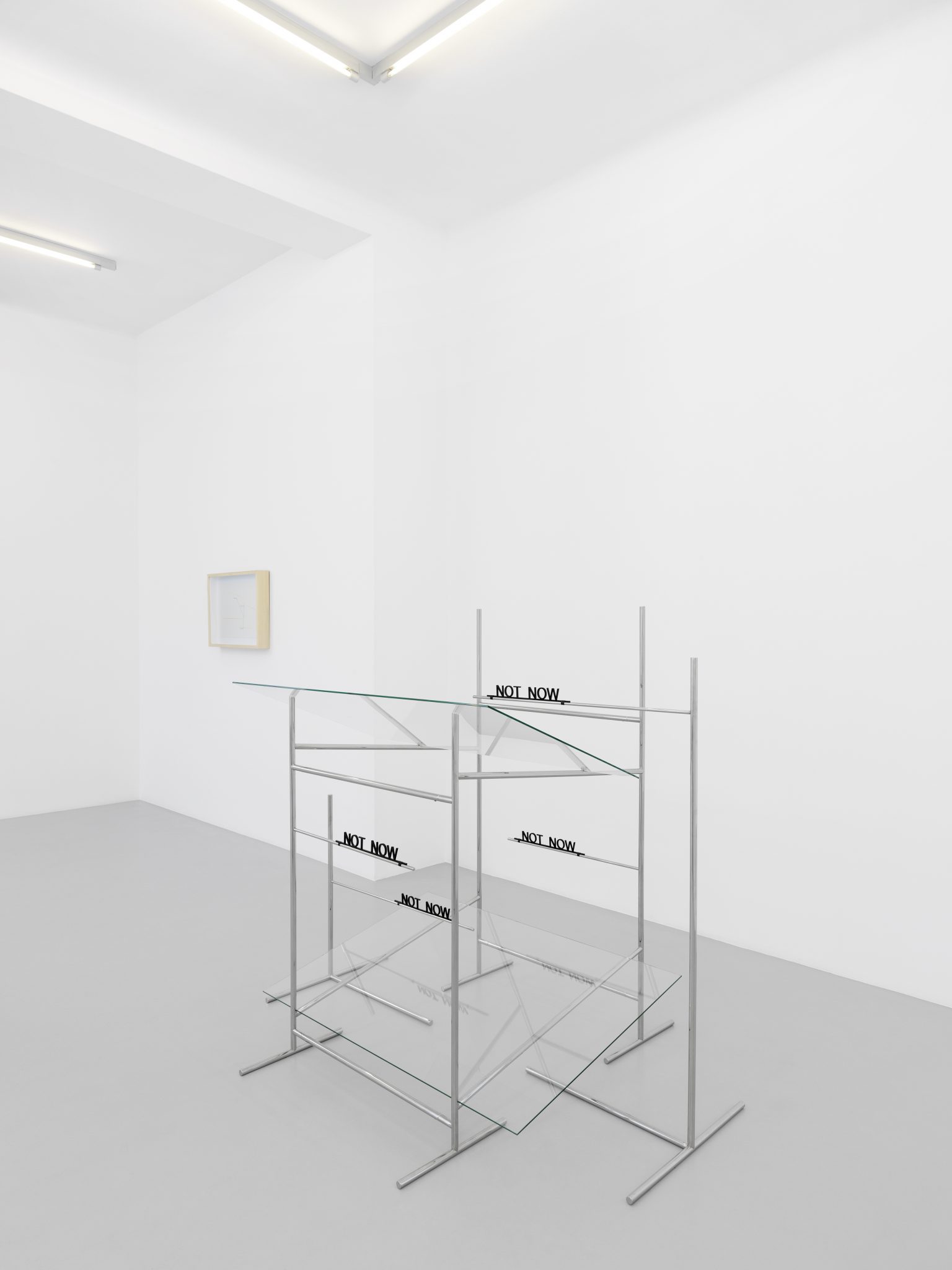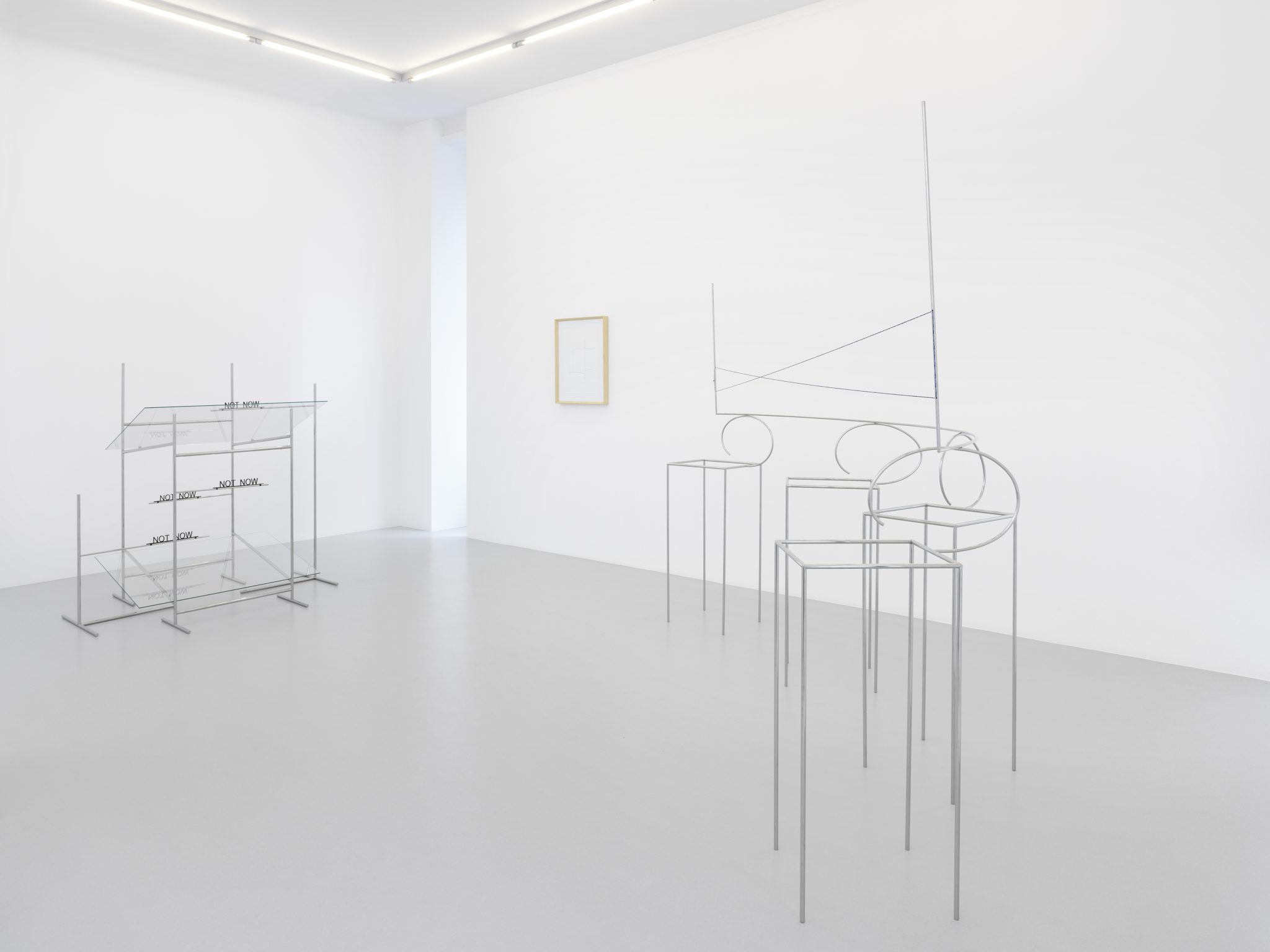 Language plays a fundamental part in this process of constructing meaning. Because of this essential relation between names and objects, between what we see and what we read, the title becomes an integral part of Waltercio Caldas’s work. Language introduces a new approach, that of reading, and also confers another dimension to the word – its physical presence. For instance, in Not now (2014), words and steel rods create an inseparable ensemble, enter into a game of repetitions, reflections and transparency. This use of language, both poetic and conceptual, also allows Caldas to introduce references to art history. The titles of his sculptures often allude to names of artists, such as Brancusi (2014), and trigger a reflection on the work of art itself, on the distance between art and art history.