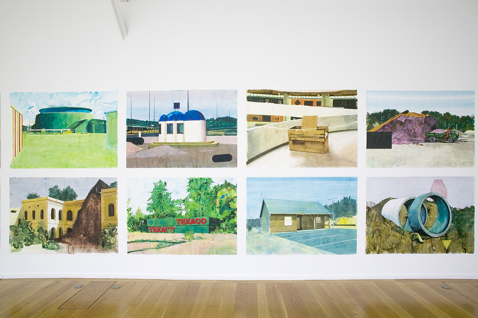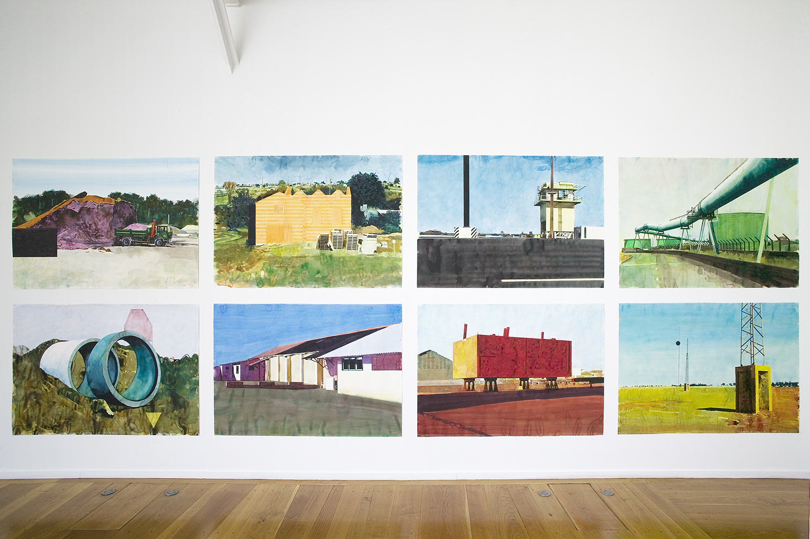 Yvan Salomone bases his work on photographs taken in situ at the port in Salomone’s native town of Saint Malo, in Rotterdam, in Shanghai and elsewhere. The introductory document is only informative; it is not a question of reproducing his images but of interpreting them. The choice of medium, liquid and transparent, confirms this motivation. Thus, when confronted with the weightlessness produced by the use of watercolour, the representation of the raw materials in these industrial sites undergoes a metamorphosis that lends a truly singular quality to the artist’s compositions. Yvan Salomone’s landscapes engender a poetic dematerialisation of reality and impose themselves on the viewer as suspended space.