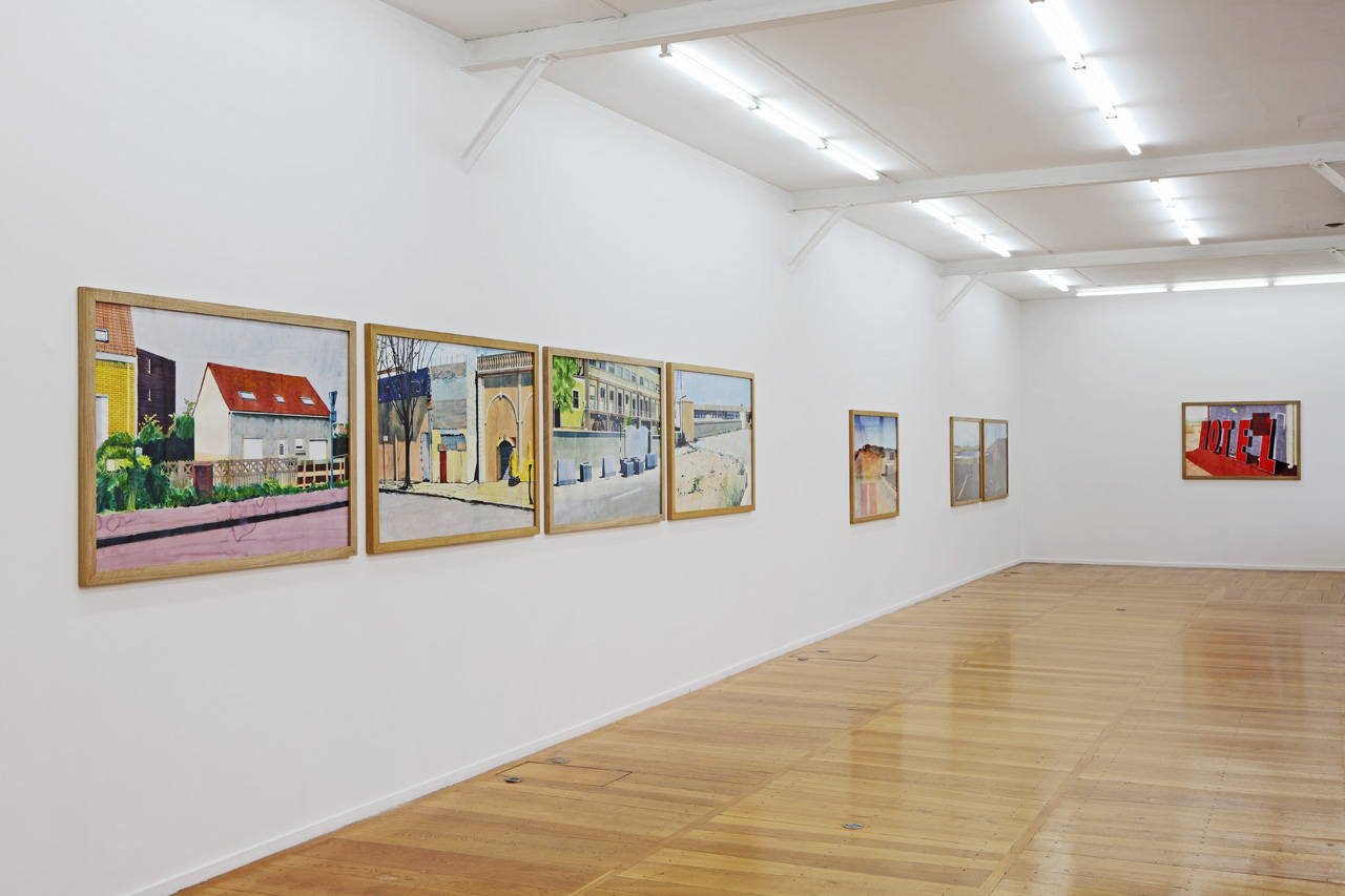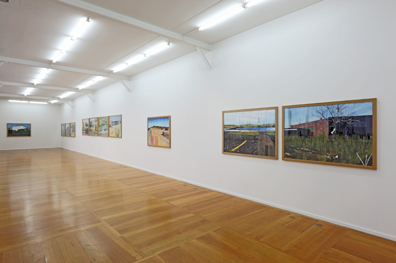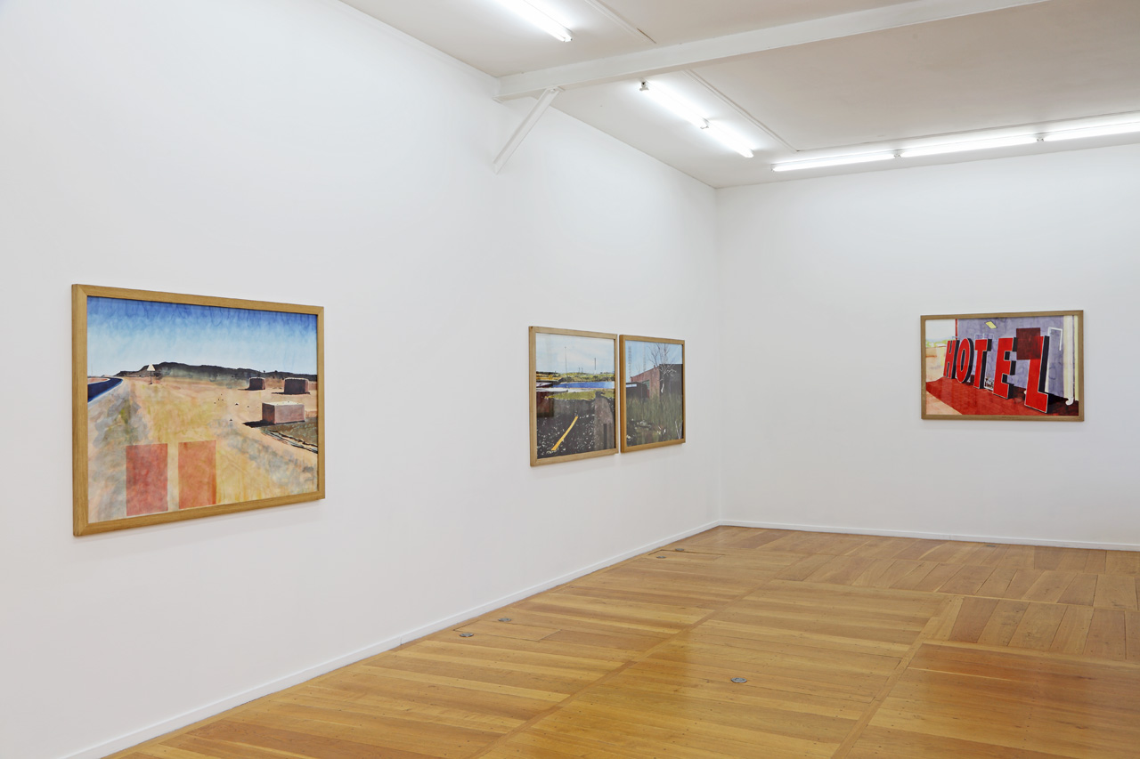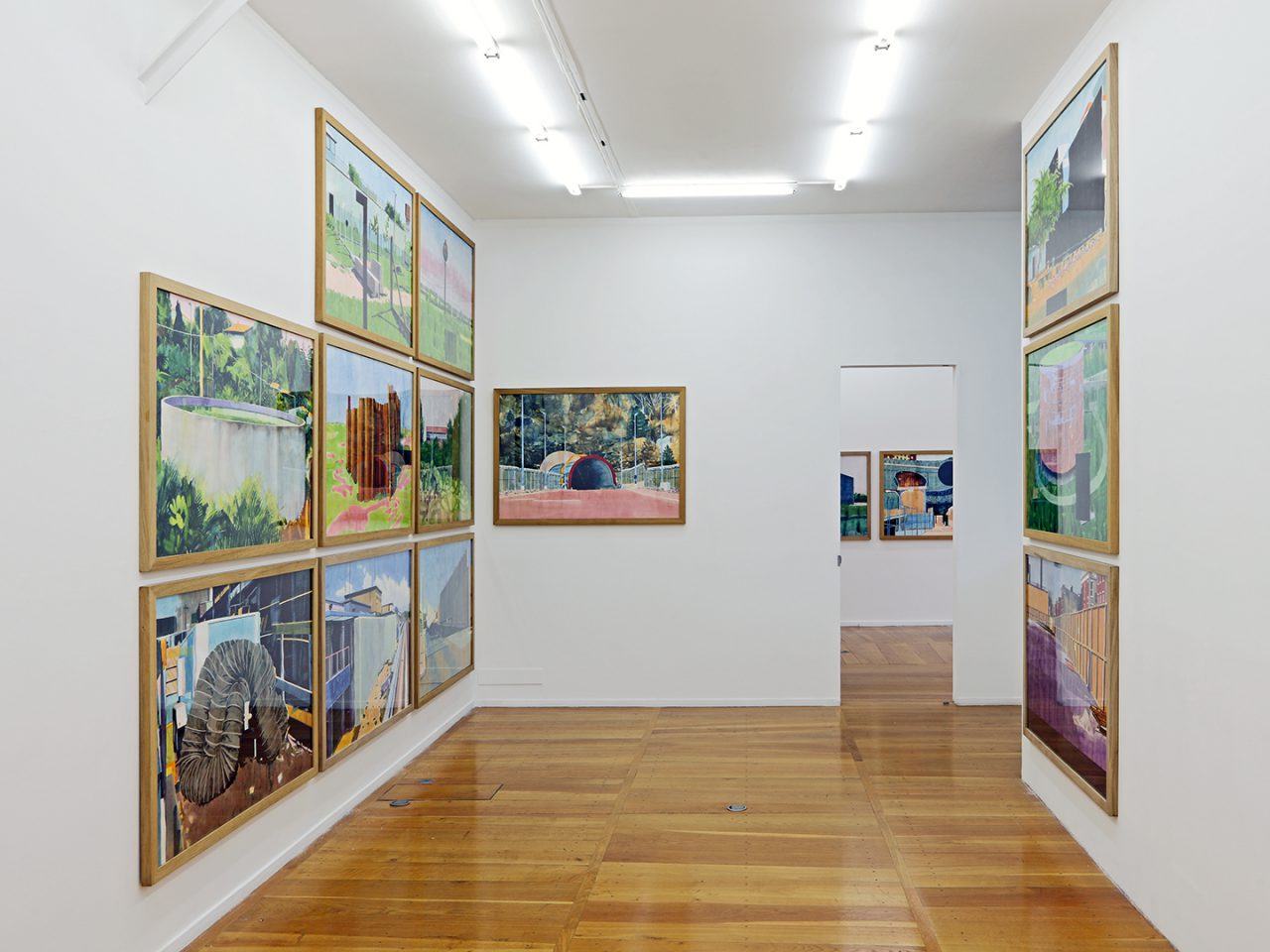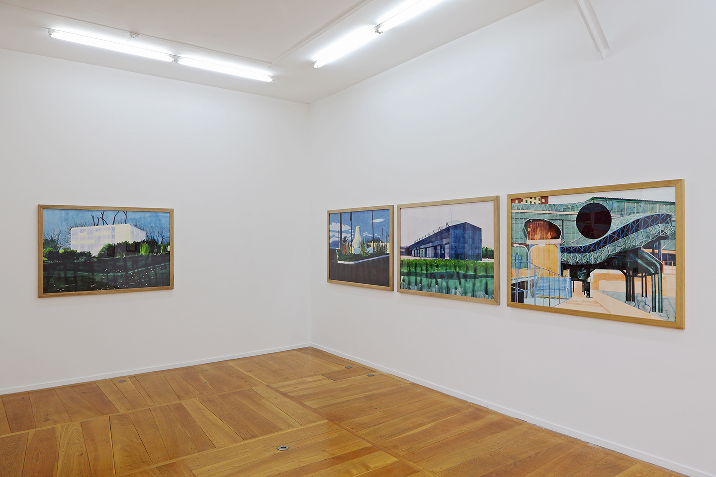 Salomone paints watercolors in his studio based on preliminary photographs taken from the four corners of the planet. He doesn’t reproduce the photos in his works, but liberally interprets them; the photos are a visual starting point. Thus the representation of raw materials (containers, cement, steel, etc.) conflict with the lightness of the watercolors and undergo a metamorphosis to create the singular nature of his compositions. The massive lines of a container ship or the rusty cylinders of heavy barrels allow him the opportunity not only to free the energy inside these massive objects, but also to give them a voice, without relieving them of their functions. Yvan Salomone shows what speaks, but purifies it, synthesizes it, and transforms it – he leaves the meaning ambiguous, allusive, and open. Yvan Salomone’s landscapes defend reality as well as a poetic dematerialization of it, and impose a perspective to the public as well as a space in suspension.