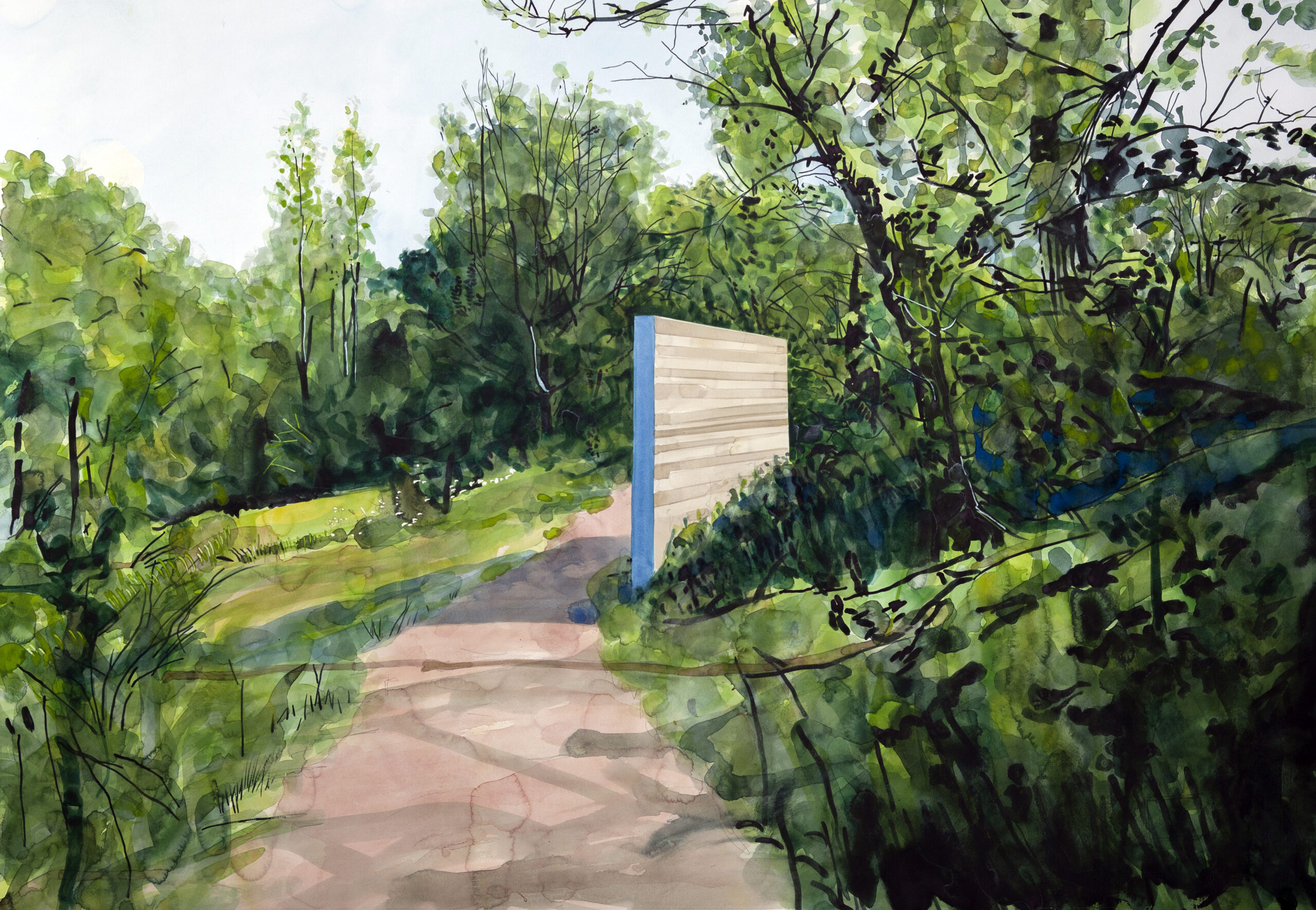 “A man moves by bicycle, by car, on foot. He roams through ports, outskirts, dunes, holiday residences, industrial zones. Sometimes he stops. A wall, a platform, a shed, a façade, or an isolated tree holds his attention. He experiences, delineates, traverses, and distills reality. A water tower cutting through the landscape like an aluminum vertebra, a faded toy-truck made monumental, a glass curtain invaded by a plant, two houses under construction becoming messengers of an intimate echo, a surface crushed by the autumn sun, dark despite its brilliance. These are simple objects, visible to all. Yet this ordinariness cracks, turns into a threshold, an enigma, a tipping point. It asserts itself. Before these blocks, ancient images rise up: battles, a flood, a tomb, a prayer, a hunting myth. The present scene changes status. Under the gaze it becomes a retention, a late variant of peripheral images. What is seen is caught in a chain. The watercolor work begins there. The format is always the same. The surface opens, yet remains measured. Certain areas are left bare. Rectangles, planes, paper reserves. Color advances patiently in successive layers. The chaos of the motif is held back, allowing another to appear, simpler, more legible. Light comes from what has been spared. The ‘I’ circulates: a child in a distant colony, a grandson in a kitchen, a reader of a book, an adult at the edge of a roundabout, a port, a beach, a parking lot. Memories of films and music cling to objects. At times, humor surfaces. Elsewhere, unease: flood, darkened horizon. Nothing is resolved. Objects remain partly mute. Images incomplete. Painting does not close the enigma. It merely organizes a space where reality, memory, light, and darkness meet, without conclusion.”