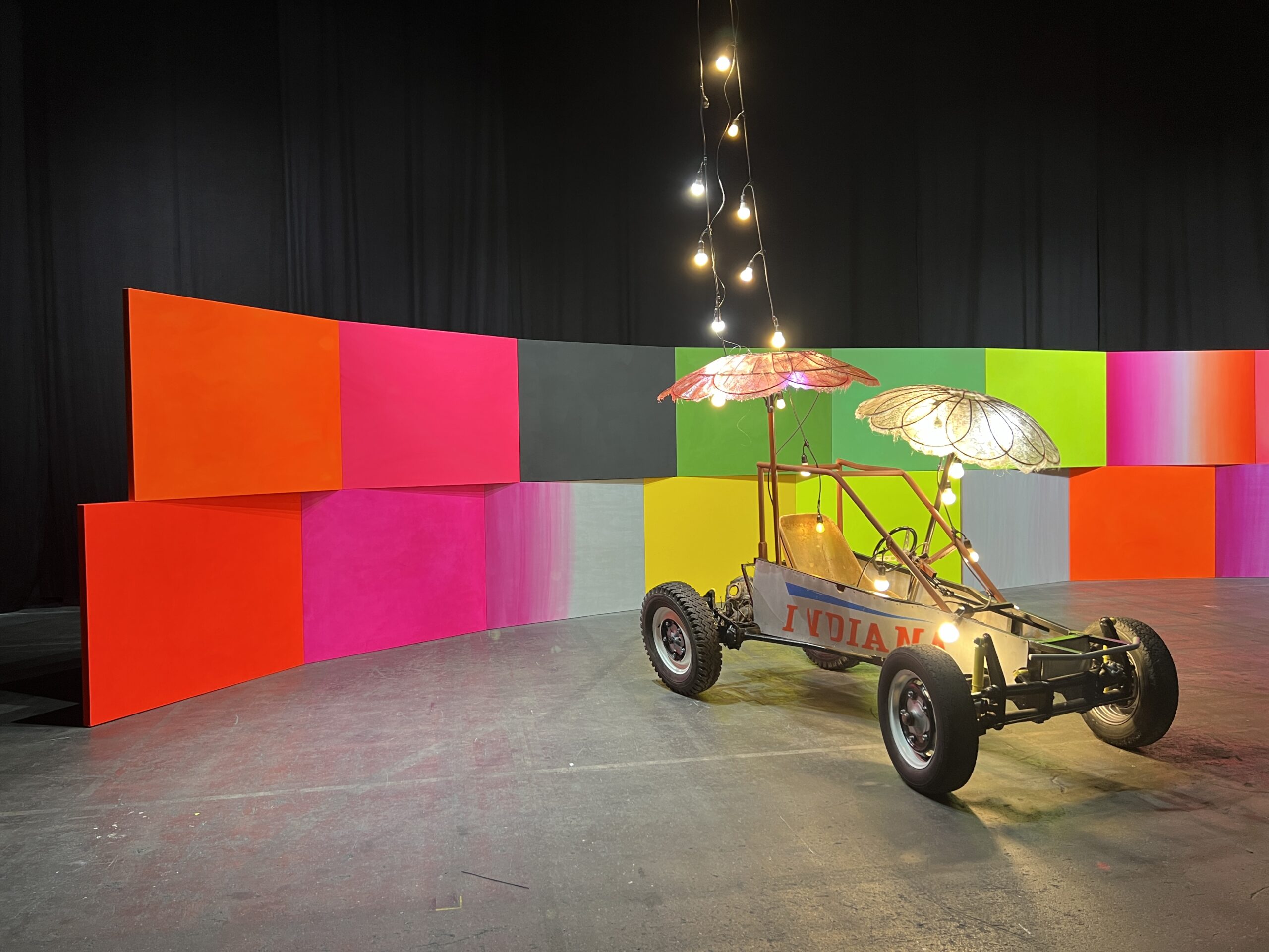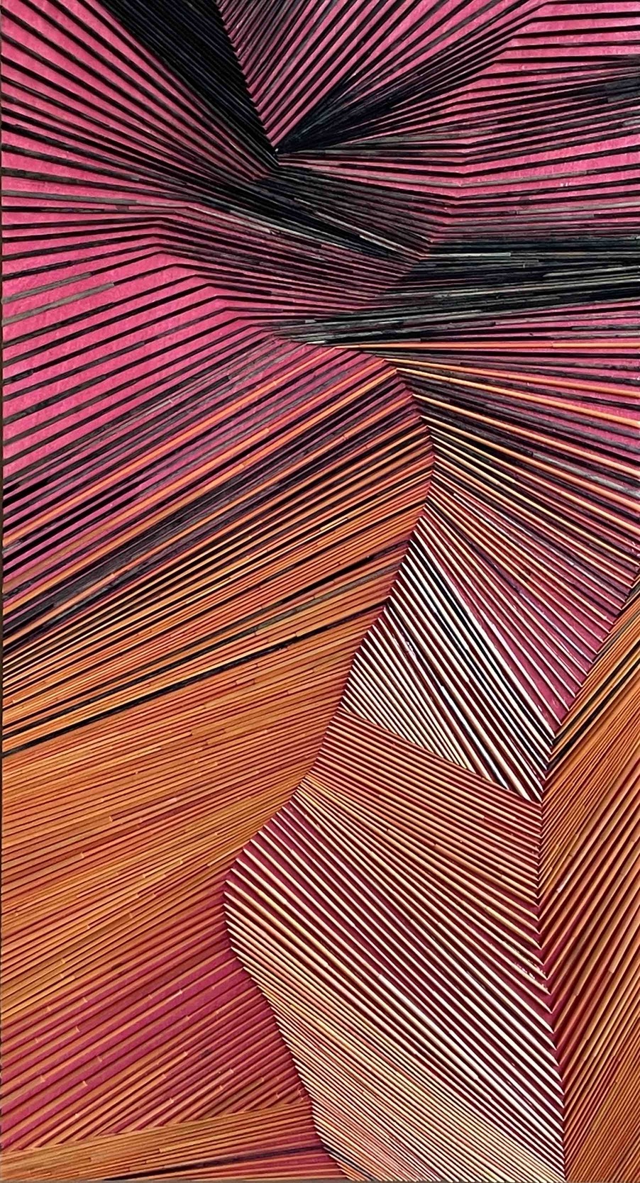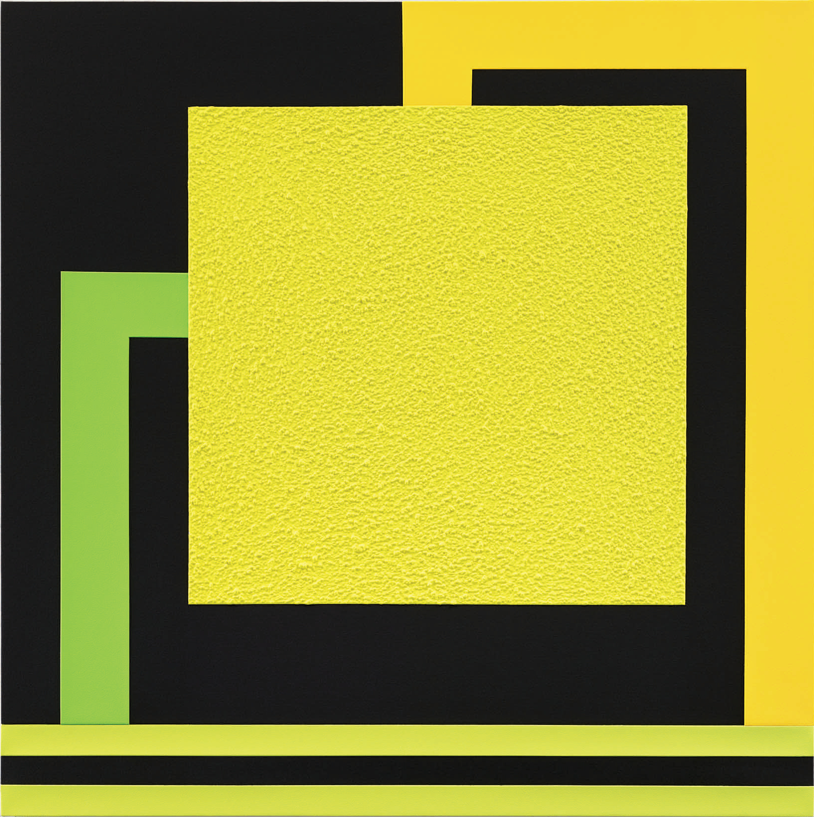 Acrylic, fluorescent acrylic, and Roll-a-Tex on canvas