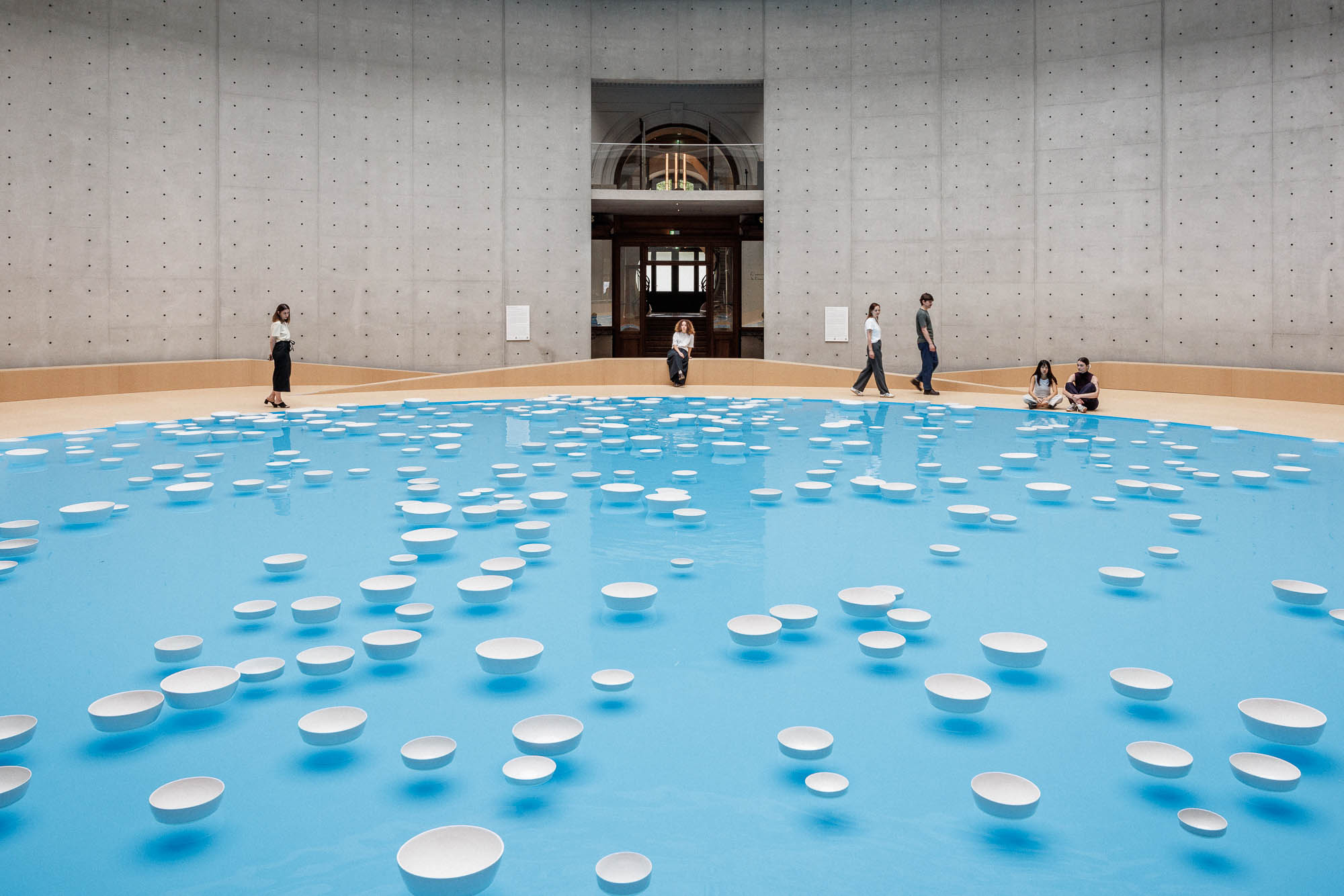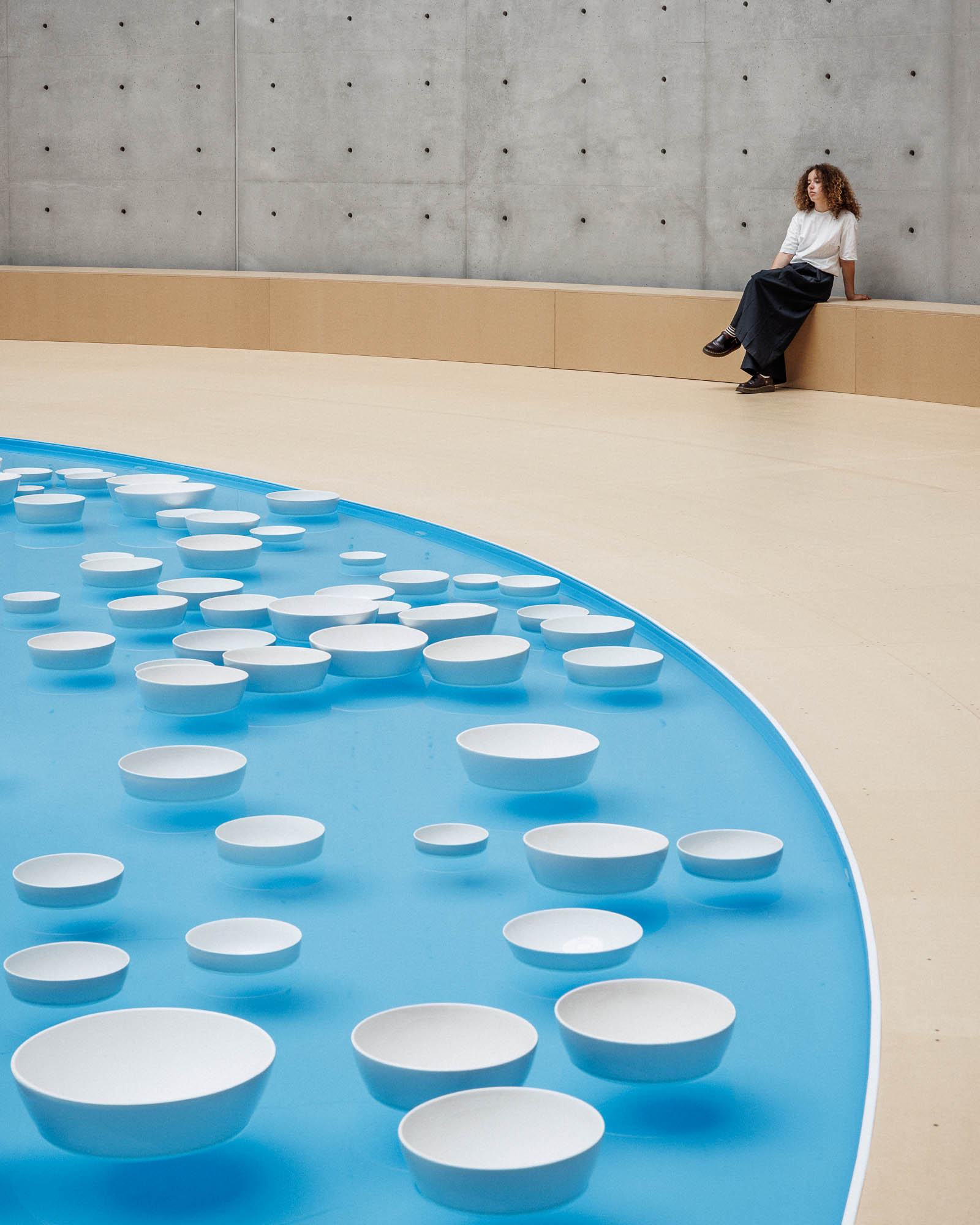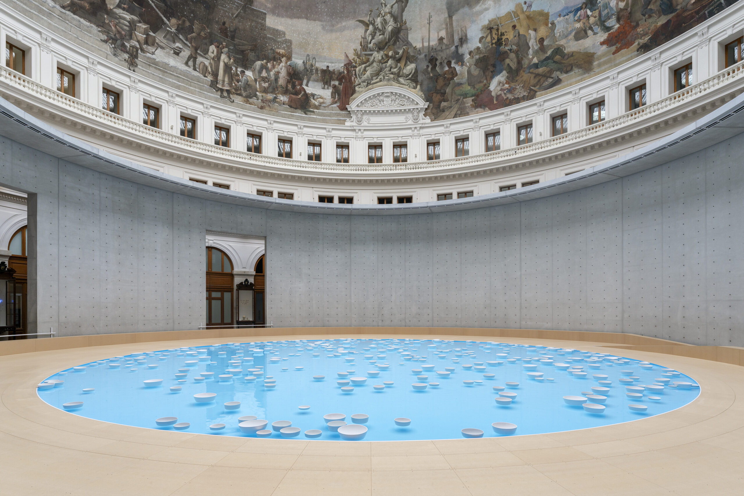 The Bourse de Commerce — Pinault Collection embraces the colors of the summer season with clinamen, an aquatic and musical installation by Céleste Boursier-Mougenot. This immersive project transforms the Rotunda into a space for contemplation, where an 18-meter-wide pool of water reflects the sky through the museum’s dome. On this blue expanse, white porcelain bowls, set in motion by a gentle current, produce melodious and incantatory sounds. These acoustic vibrations, created without the intervention of a performer, form the heart of the piece — a true symphony of the moment, evolving with the flow of invisible waves.