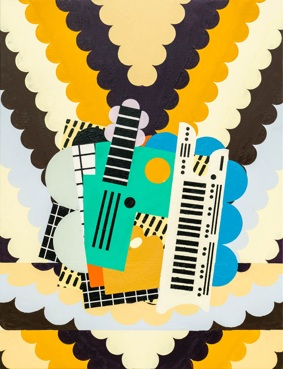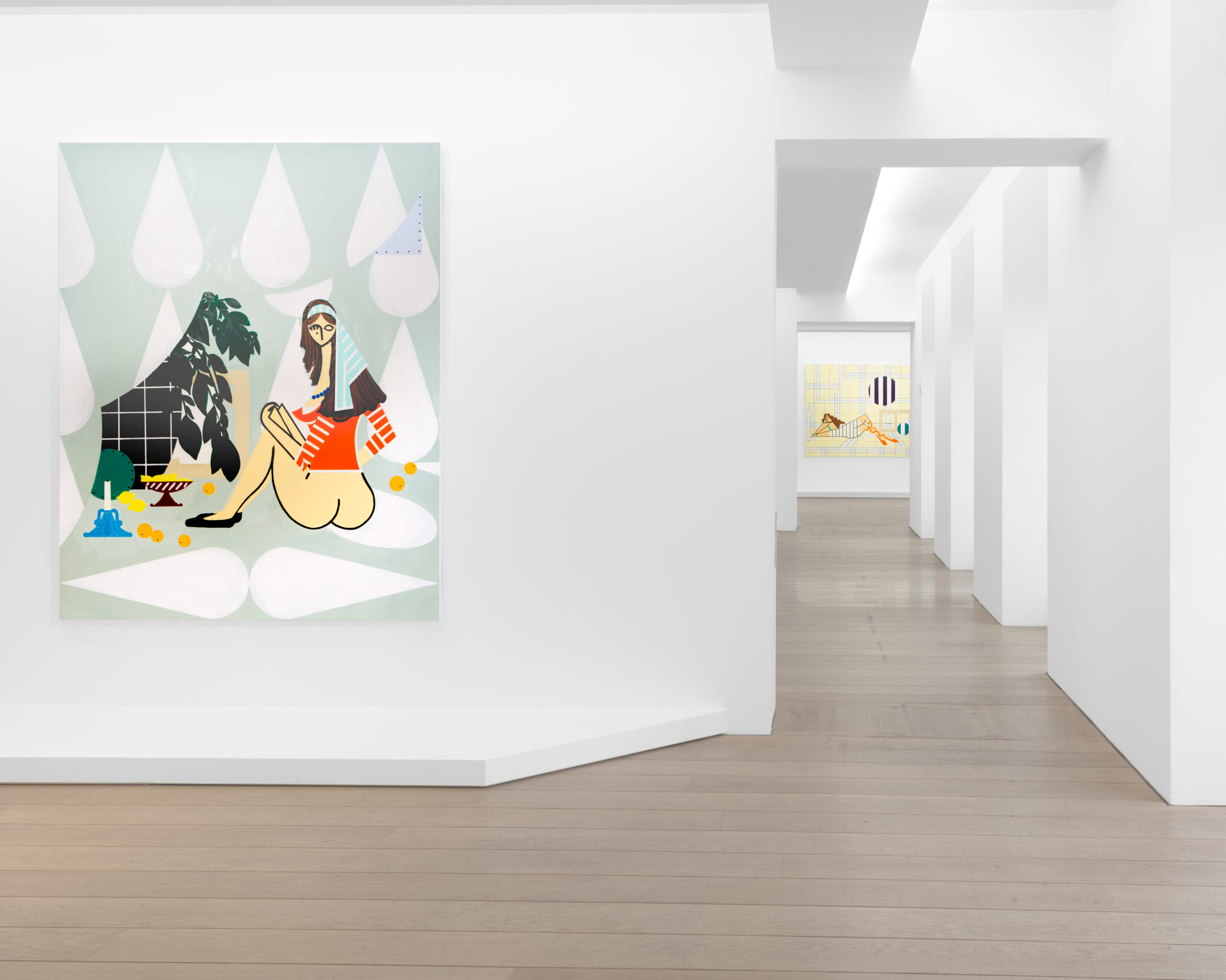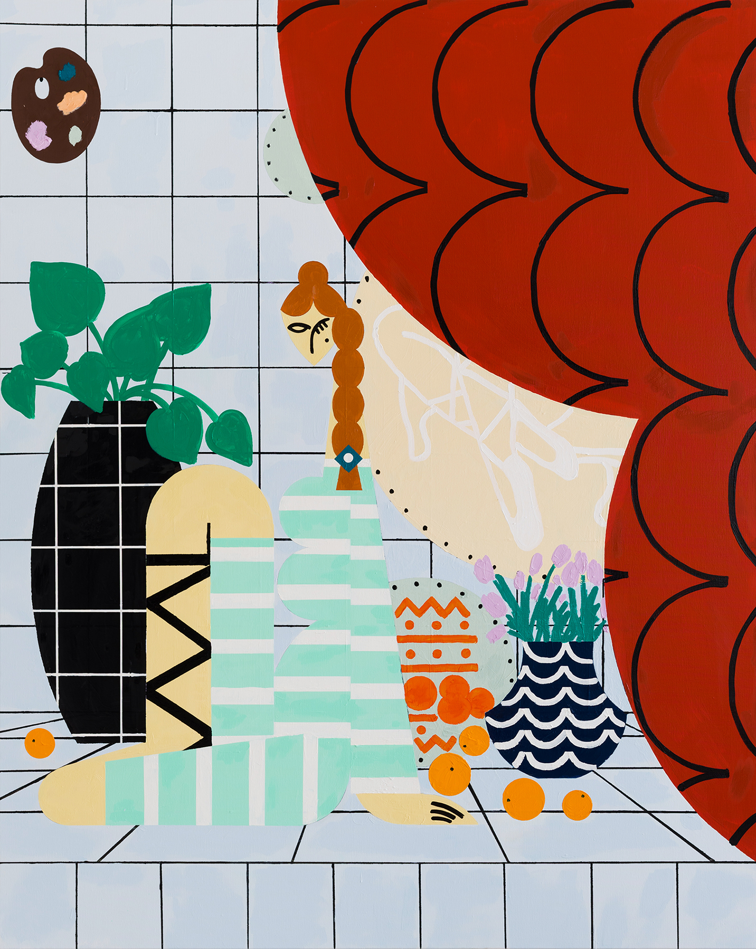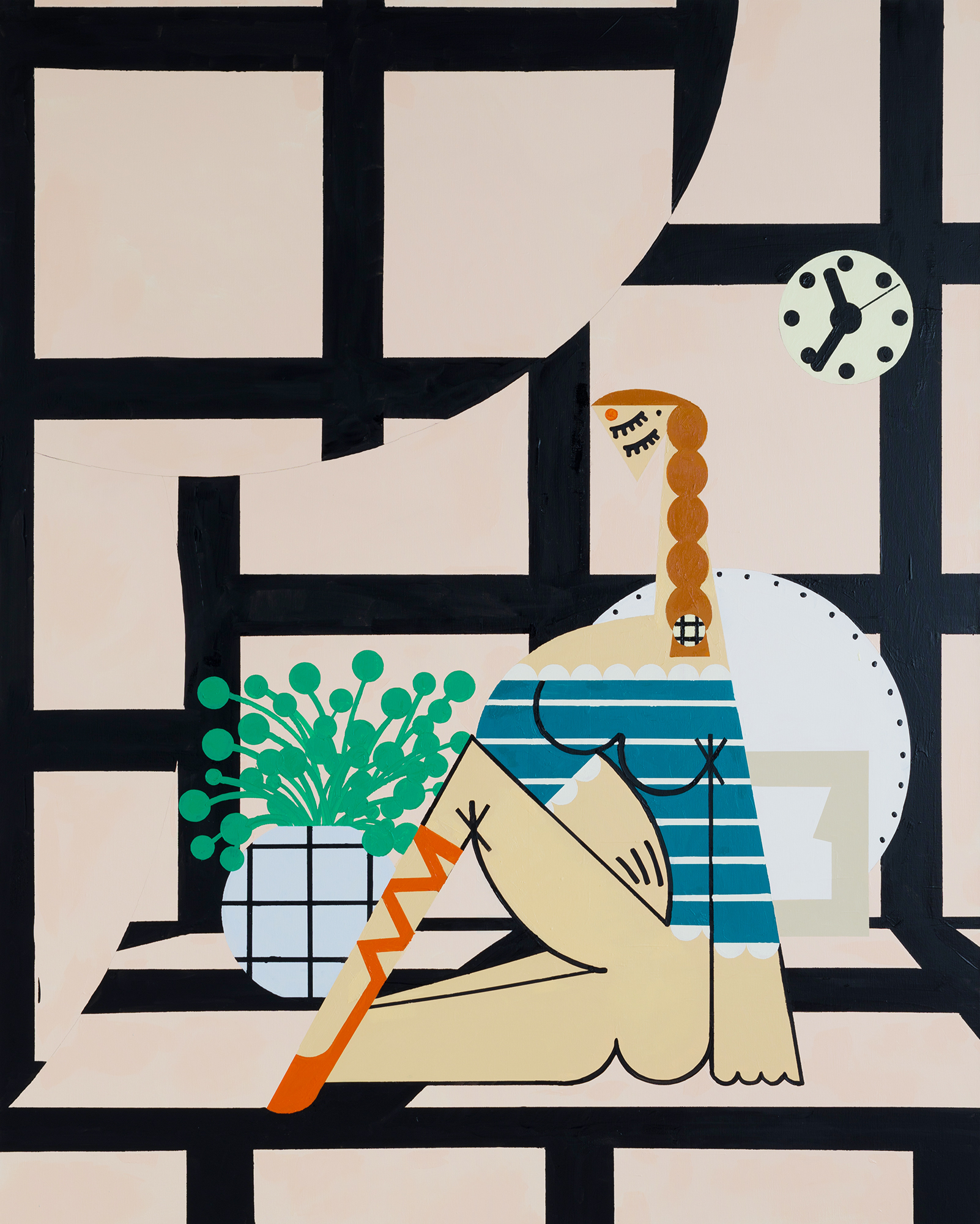 Farah Atassi’s work draws its inspiration from both ornament and modernism, developing a pictorial language based on the stylization of her drawings, muted colors and a cubist conception of space. Her paintings are almost conceptually figurative and seem to echo the cubism that Picasso developed at the end of the 1910s: the theatrical and poetic cubism of his curtain for the “Parade” ballet in 1917, as well as his 1915 “Harlequin,” his refined still life collages and his first “Bathers.”