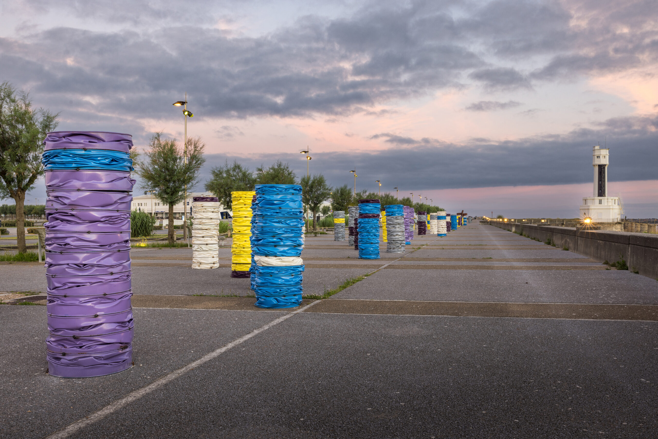 Almost like a ready-made, this industrial waste metamorphoses into an elementary form of art history. This work consists of creating a signal which encourages strolling along the promenade of the mouth. It also prompts reflection on these elements of packaging and transport that are inseparable from our globalized world and the need for their recycling.