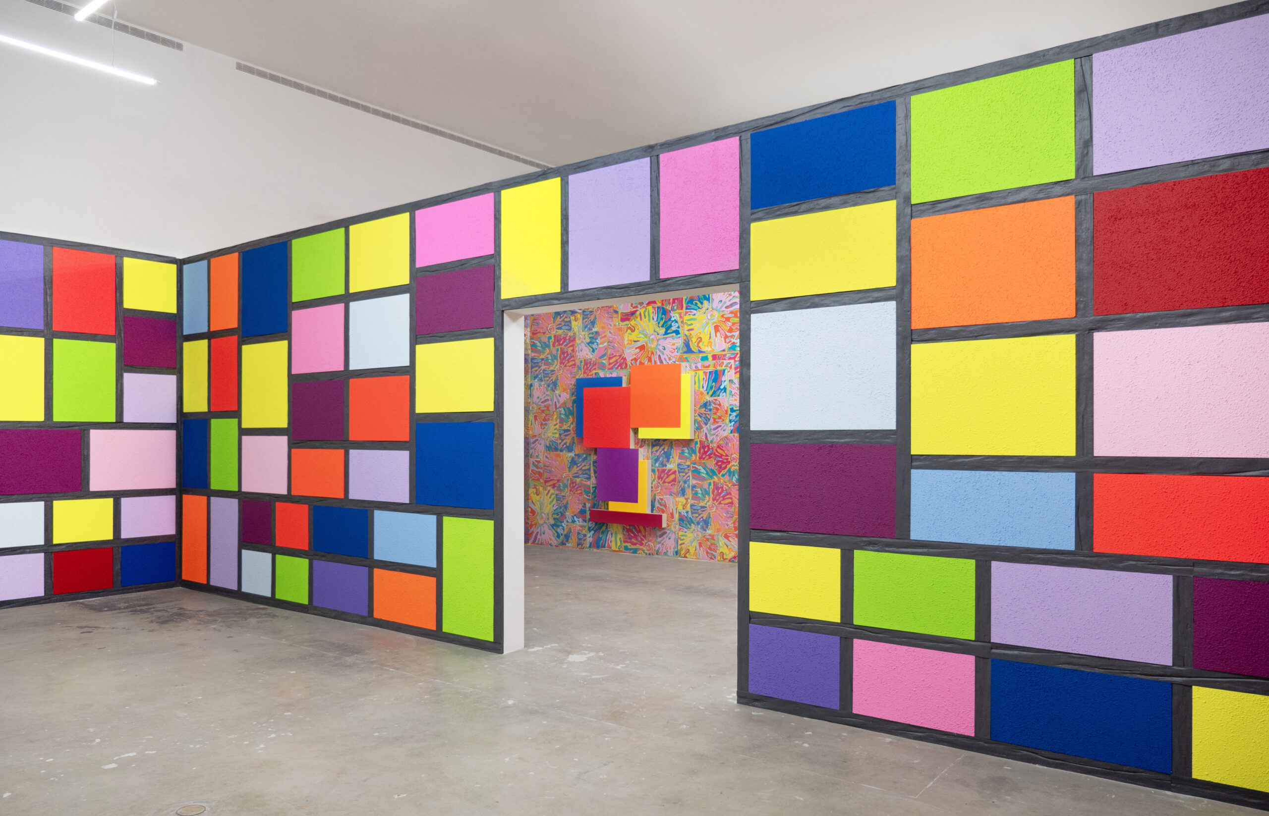 The Mirror Stage thrusts viewers into a mirrored universe comprised of two nearly identical spaces, each accessed through separate doors at opposite ends of a large rectangular gallery. A solid dividing wall inserted at the center of the gallery prevents viewers from passing through from either side, forcing them to move back and forth through the two entrances in order to experience the installation in its entirety. Halley further amplified the mirroring effect of the two spaces by laminating walls with highly reflective vinyl. Monumental neon-colored canvases and grids of brightly hued textured panels add to the viewer’s vivid and uncanny experience as they navigate real, pictorial, and virtual space.